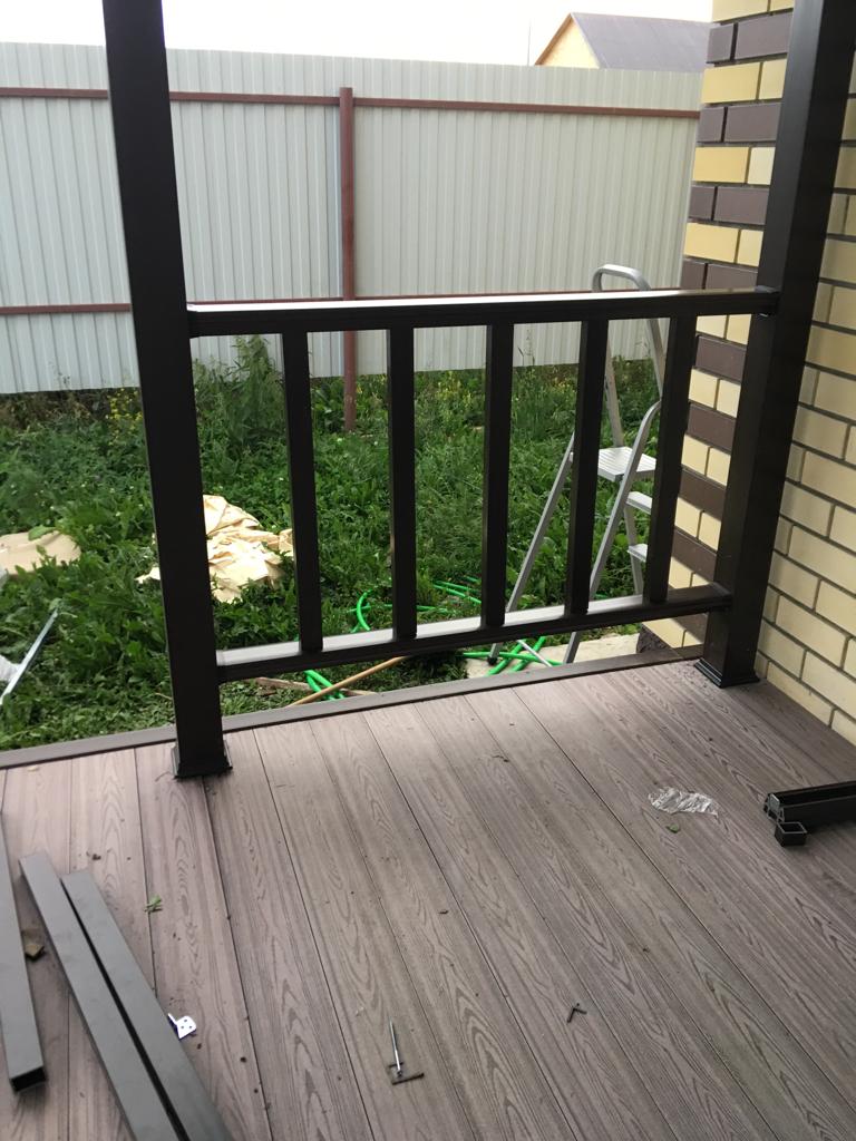 Ограждения и перила лесенки также марки Holzhof. Особенностью монтажа ограждений из ДПК Holzhof стало то, что трехметровый профиль был надет на металлические столбы-опоры прямо до потолка крыши, что придало всем ограждениям единый стиль цвета венге и органично вписалось в архитектуру дома.